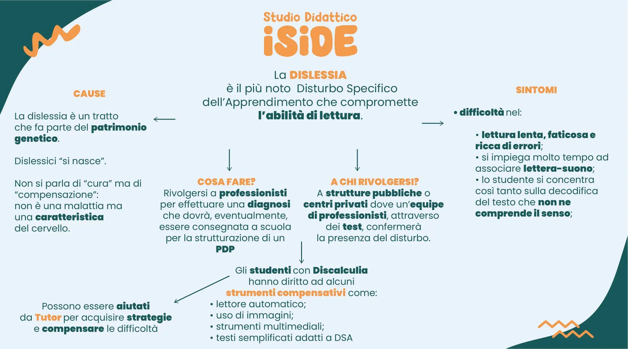 - NON È (ma potrebbe essere) collegata ad altri Disturbi Specifici dell’apprendimento (DSA), come Discalculia, Disgrafia o Disortografia;